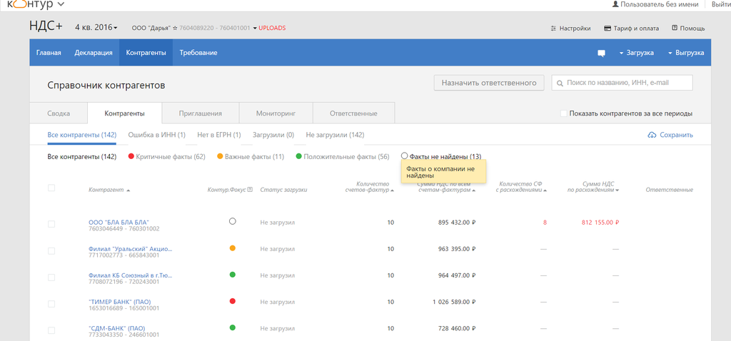 В новом справочнике контрагентов есть сводная информация по каждой компании: количество счетов-фактур, какие из них с расхождением и на какую сумму. При этом  контрагенты отсортированы по сумме НДС в счетах-фактурах с расхождениями. Таким образом вы сразу видите, с каких контрагентов лучше начать сверку.